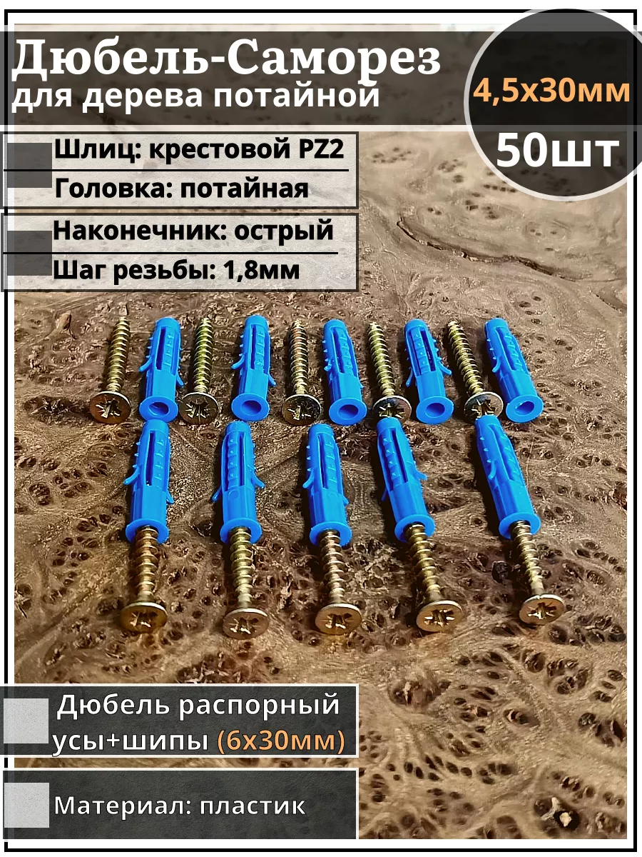 Шуруп саморез 4,5х30 мм ЖЦ с дюбелем 6х30, 50 шт.