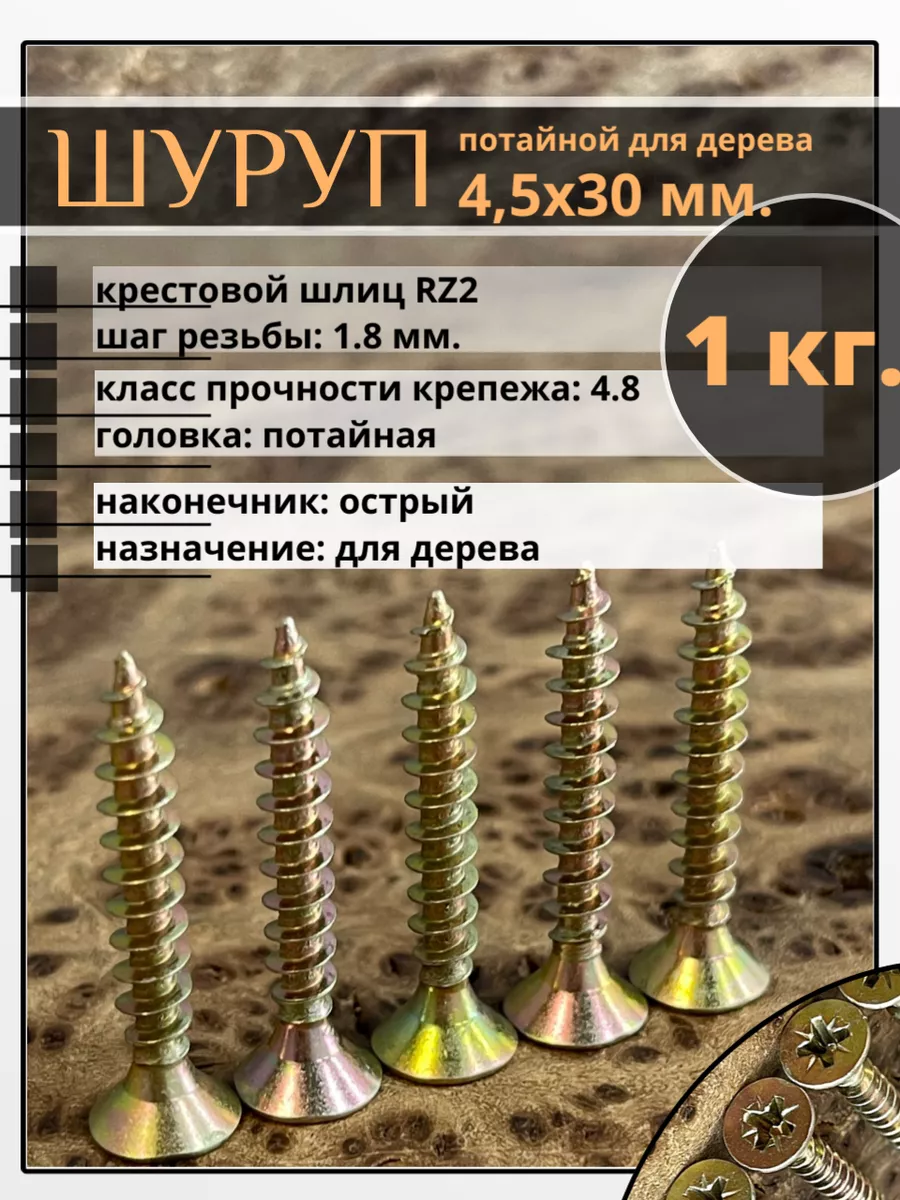 Шуруп саморез потайной для дерева 4,5х30 мм, желтый цинк, 1 кг.