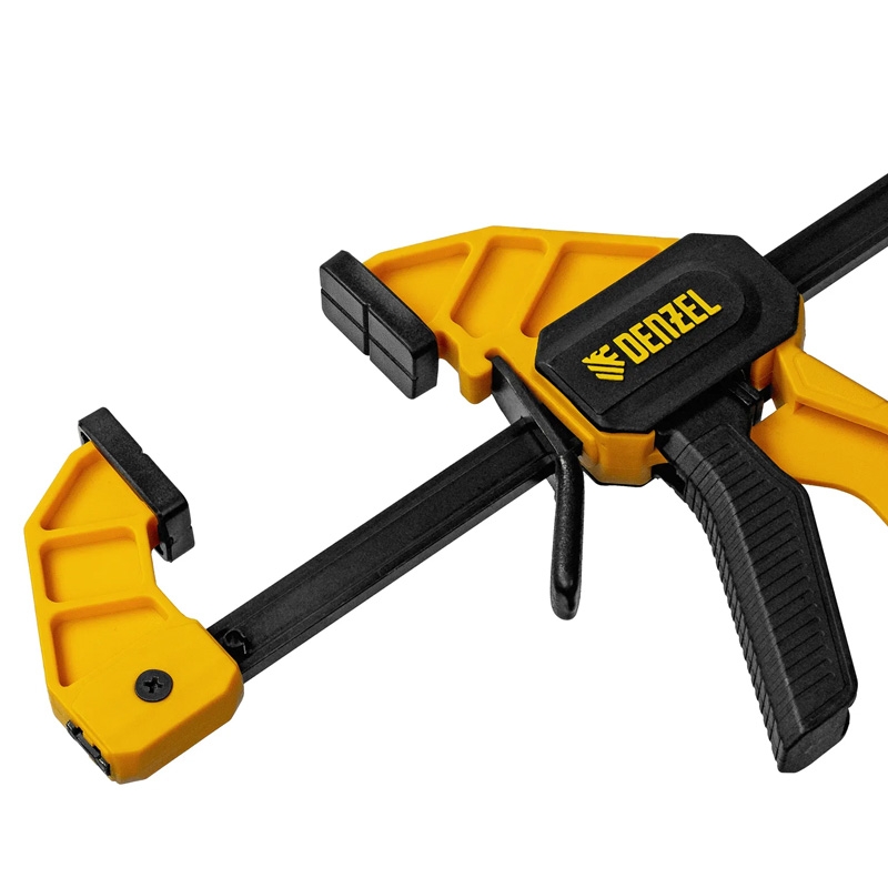 Струбцина весит всего 360 г, а обрезиненная кнопка фиксации обеспечивает удобный захват, что делает её комфортной в использовании. Инструмент подходит как для бытовых, так и для профессиональных задач.