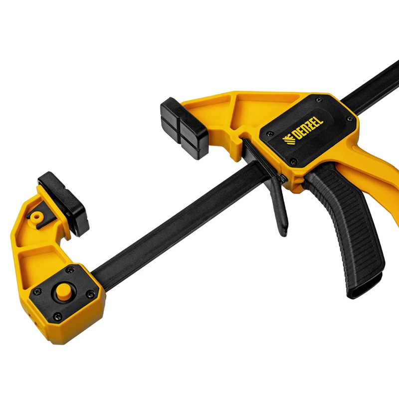 Струбцина весит всего 560 г, а обрезиненная кнопка фиксации обеспечивает удобный захват, что делает её комфортной в использовании. Инструмент подходит как для бытовых, так и для профессиональных задач.