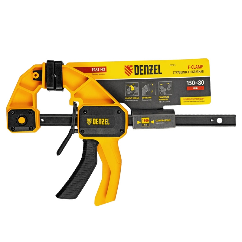 Струбцина F-образная быстрозажимная Denzel 20505 — это инструмент для надёжного фиксирования деталей при их обработке, склеивании и других работах. Ширина струбцины составляет 150 мм, глубина — 80 мм. Её нейлоновый корпус усилен, благодаря чему устойчив к ударам и падениям с небольшой высоты.
