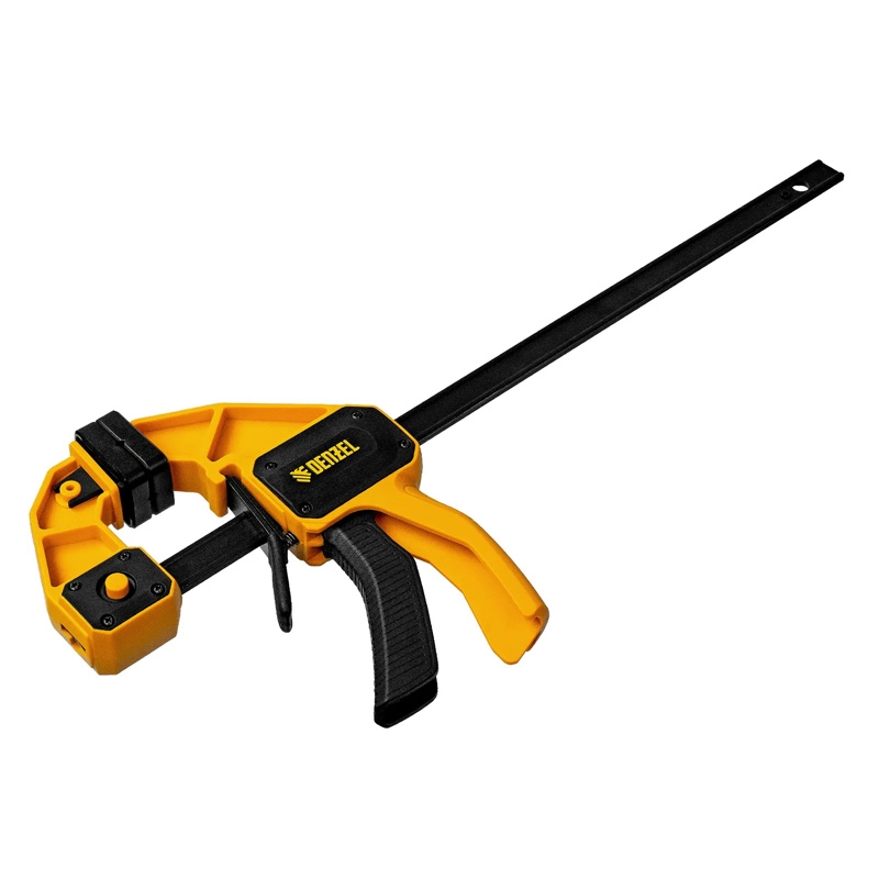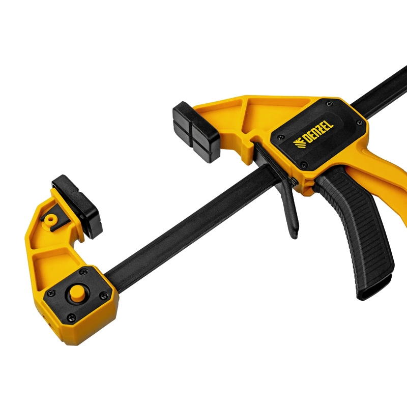 Струбцина весит всего 620 г, а обрезиненная кнопка фиксации обеспечивает удобный захват, что делает её комфортной в использовании. Инструмент подходит как для бытовых, так и для профессиональных задач.
