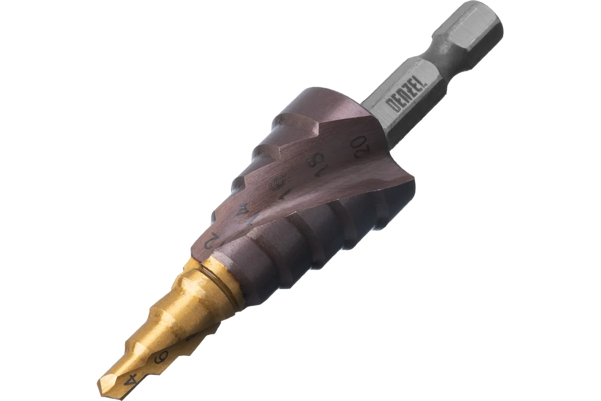Сверло ступенчатое 4-6-8-10-12-14-16-18-20 мм,по мет..Р6М5К5,шестигр.хв.Denzel