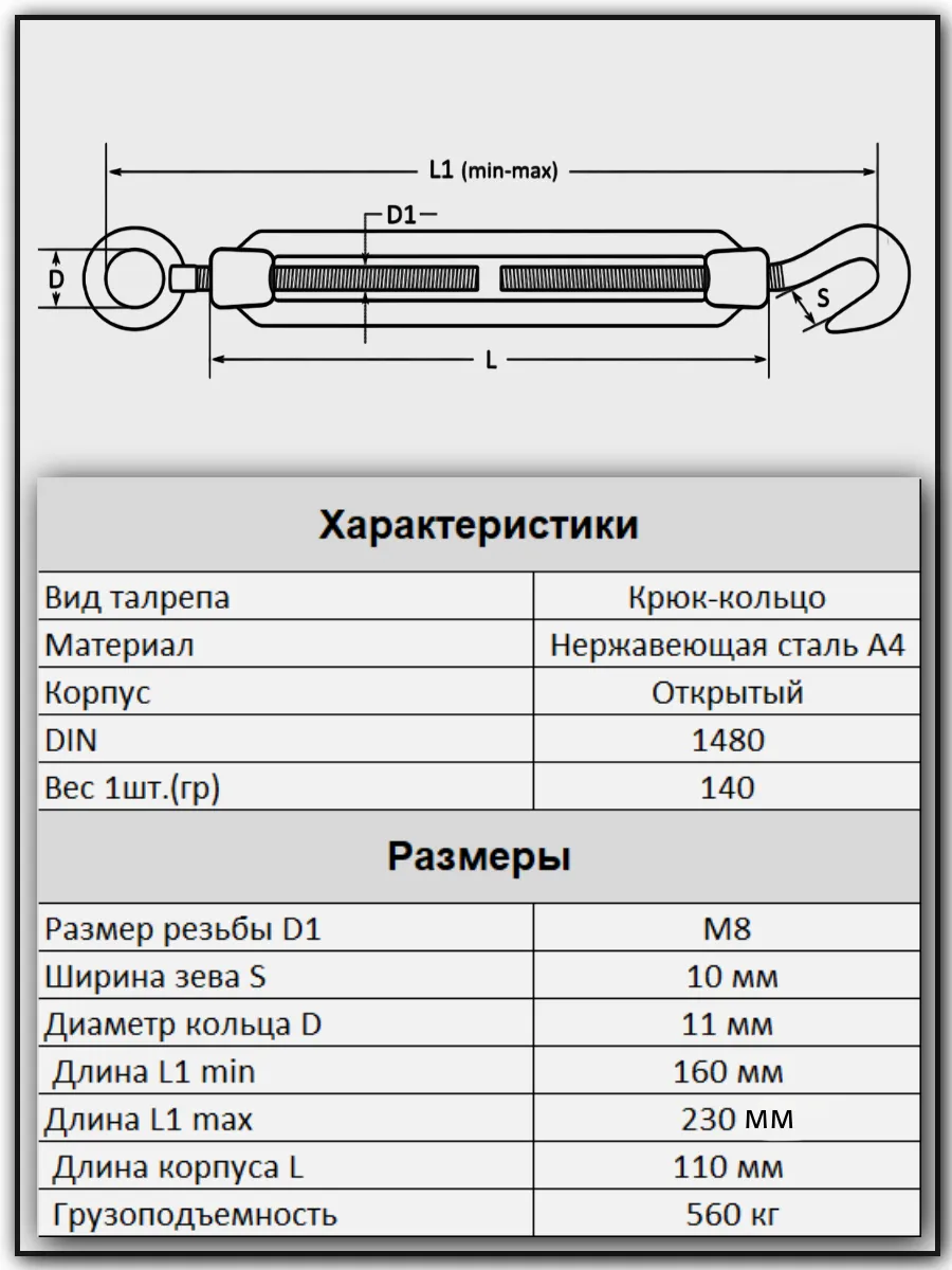 | Талреп крюк-кольцо нержавеющий А4 М8 DIN1480, 1 шт. | A4BJ30800091A07ф1 | 1 шт. |