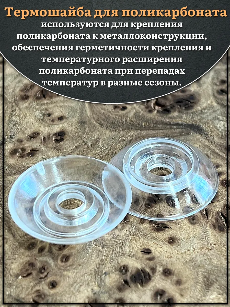 Использование термошайб придаёт конструкции эстетичный и законченный вид: при правильном подборе цвета шайба не будет выделяться ярким пятном на фоне листа поликарбоната, а защёлкивающаяся крышка шайб скроет саморезы.