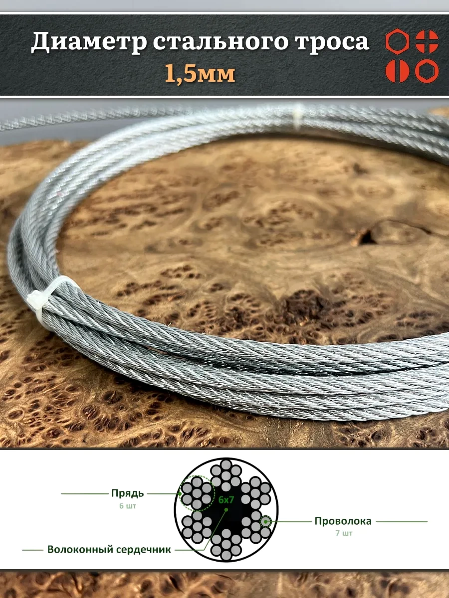 Трос стальной d1,5 оцинкованный без оплетки, 10 метров