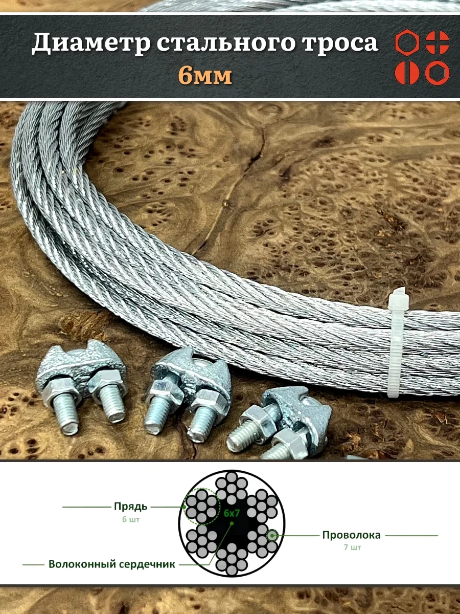 | Трос стальной d6 с зажимами (4 шт.) оцинкованный без оплетки, 30 метров | B6H000600032000/B61100600031007-30м | 1 шт. |