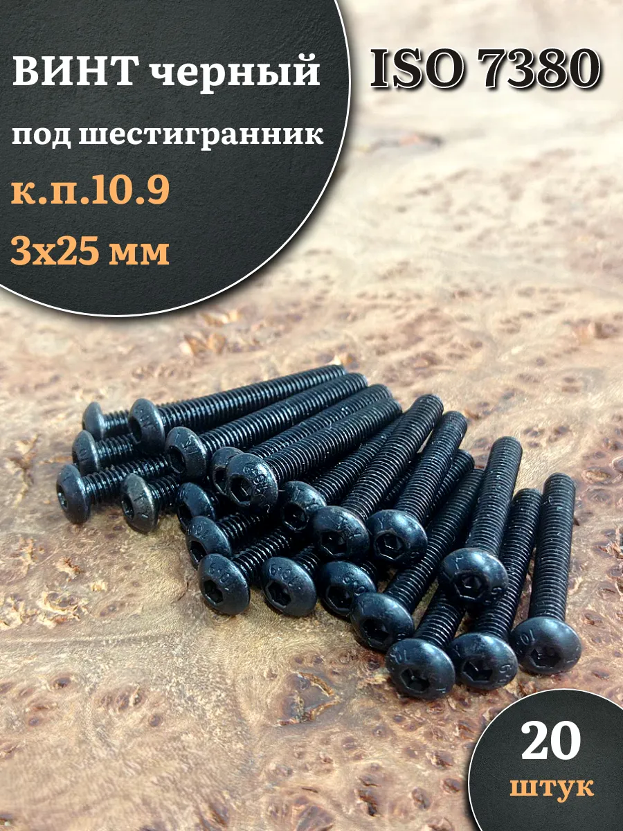 Винт чёрный М3х25 ISO 7380 под шестигранник к.п.10.9, 20 шт.
