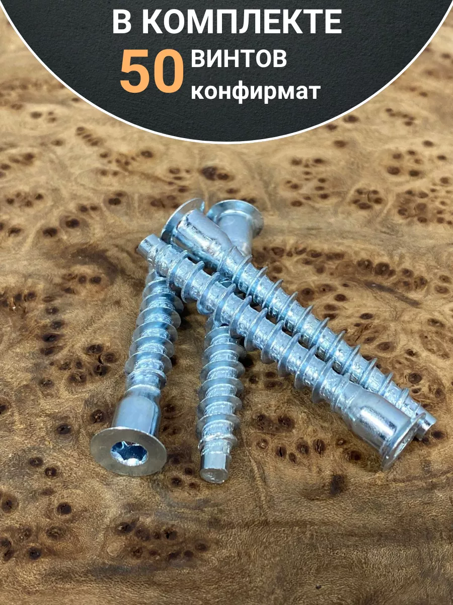 Конфирматы представляют собой винты, оснащенные потайной головкой, в которой имеются шлицы двух типов. Стержень такого винта имеет тупой конец, а на его рабочую часть нанесена широко выступающая резьба. Нижние витки резьбы предназначены для нарезания резьбы в предварительно подготовленном отверстии, поэтому они имеют коническую форму и выполнены с зазубринами. Под головкой евровинты имеют гладкую (без резьбы) поверхность. Есть защитное покрытие из цинка, латуни или никеля, а изготавливают их из высококачественной углеродистой стали. Используется при производстве корпусной мебели.