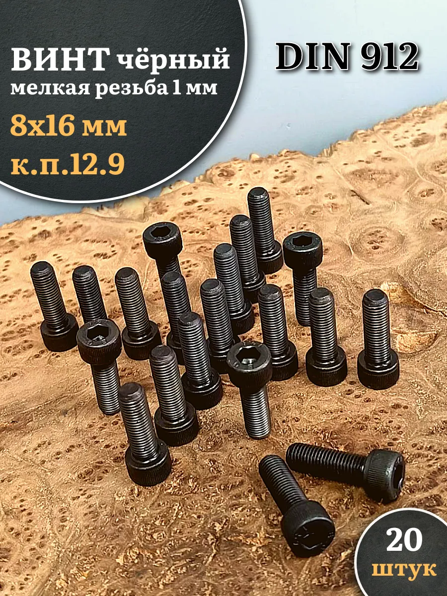 Винт мелкая резьба чёрный к.п.12.9 8х16х1 DIN912, 20 шт.