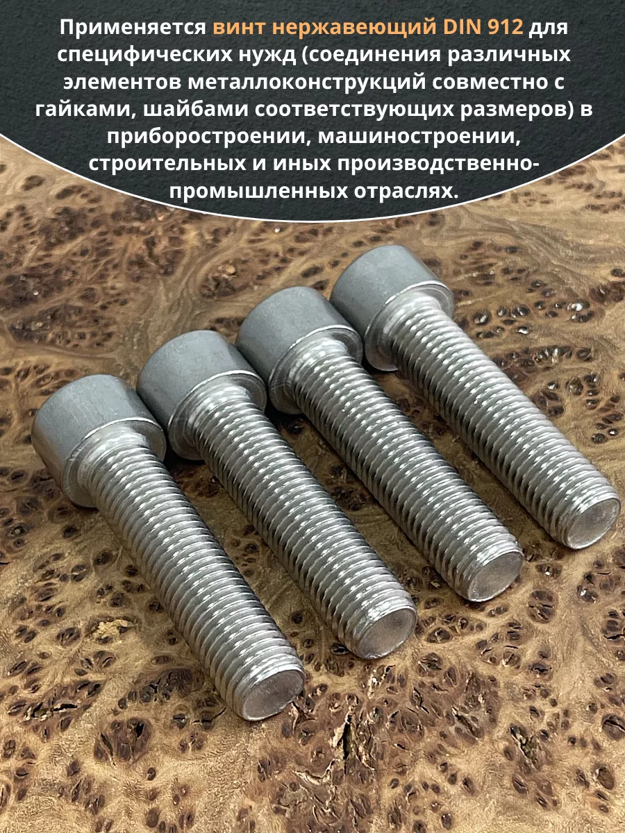 Винт DIN 912 представляет собой металлический стержень с метрической резьбой и головкой цилиндрической формы. Изготовляется из разных материалов, в зависимости от области его применения: сталь 8.8,10.9 или 12,9, сталь с оцинкованным покрытием, нержавеющая сталь А2- А5, латунь, пластик. Прочность на разрыв стали подобного класса достаточно высока, поэтому DIN 912 применяют в конструкциях, которые подвержены серьезным нагрузкам. Применяется винт DIN 912 для специфических нужд (соединения различных элементов металлоконструкций совместно с гайками, шайбами соответствующих размеров) в приборостроении, машиностроении, строительных и иных производственно-промышленных отраслях.