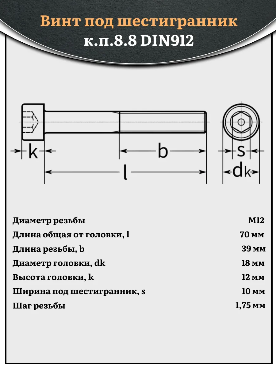 Винт под шестигранник НР 12х70 мм ОЦ к.п.8.8 DIN912, 10 шт.