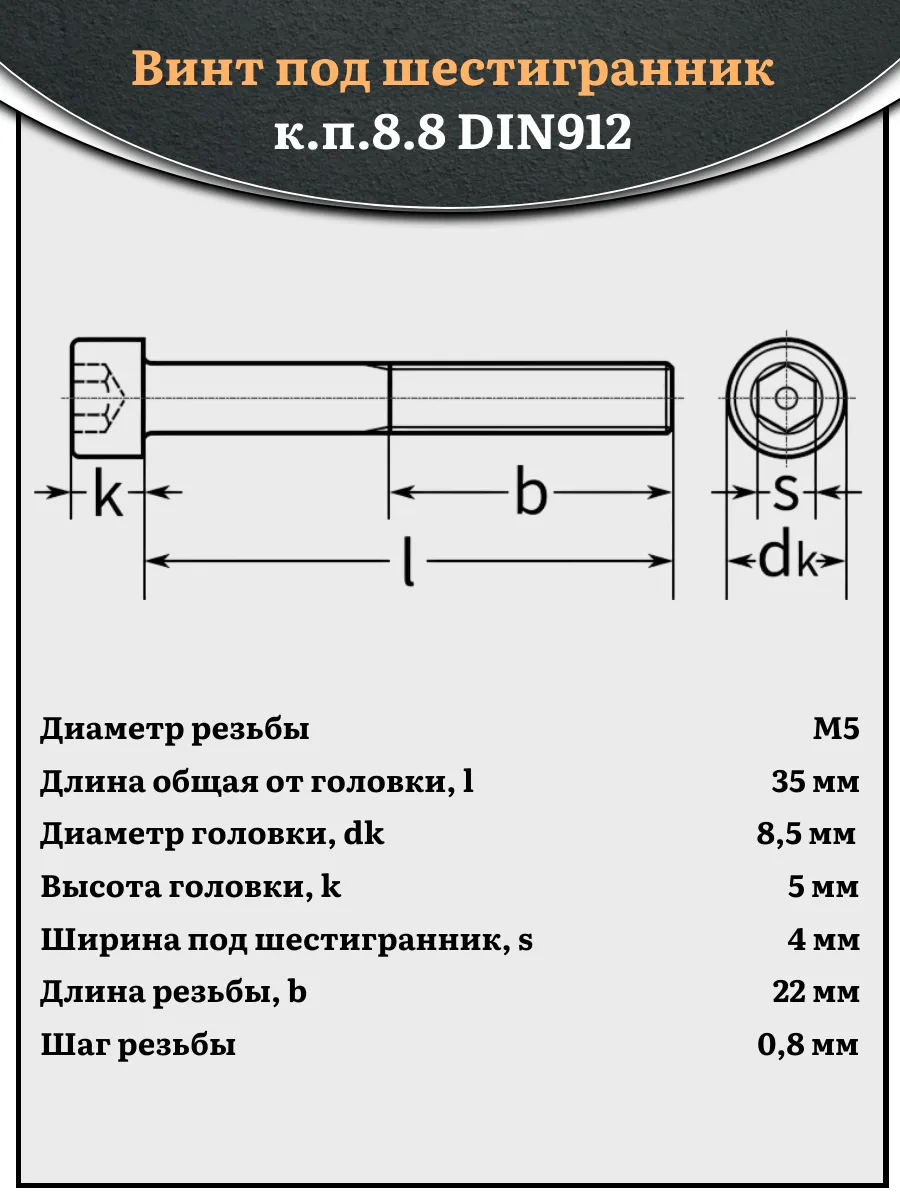 Винт DIN 912 представляет собой металлический стержень с метрической резьбой и головкой цилиндрической формы. Изготовляется из разных материалов, в зависимости от области его применения: сталь 8.8,10.9 или 12,9, сталь с оцинкованным покрытием, нержавеющая сталь А2- А5, латунь, пластик. Прочность на разрыв стали подобного класса достаточно высока, поэтому DIN 912 применяют в конструкциях, которые подвержены серьезным нагрузкам. Применяется винт DIN 912 для специфических нужд (соединения различных элементов металлоконструкций совместно с гайками, шайбами соответствующих размеров) в приборостроении, машиностроении, строительных и иных производственно-промышленных отраслях.