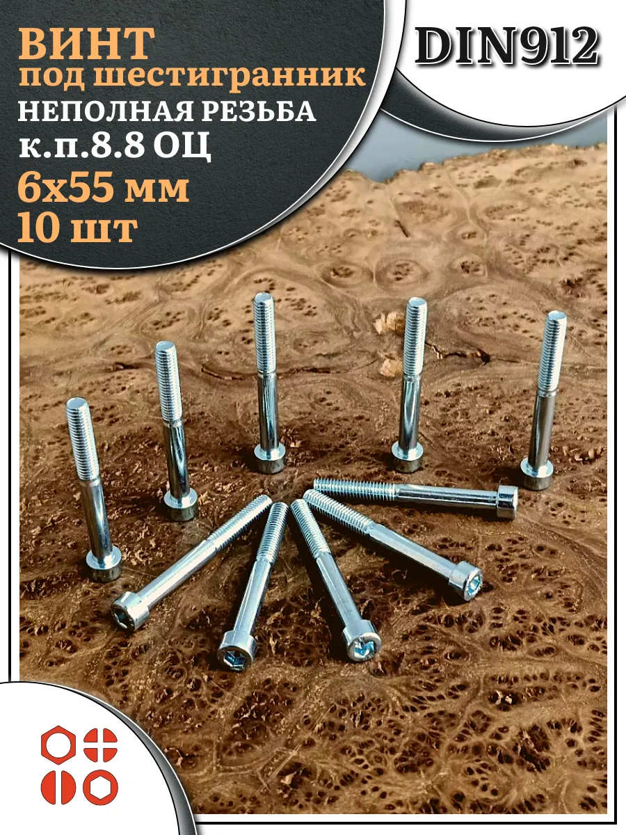 Винт под шестигранник НР 6х55 мм ОЦ к.п.8.8 DIN912, 10 шт.