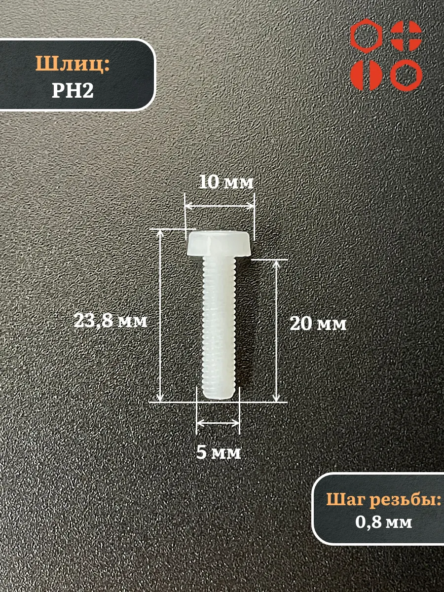 | Винт полиамидный 5х20 мм DIN7985 (пластик), 4 шт. | вп5207985ф4 | 1 шт. |
