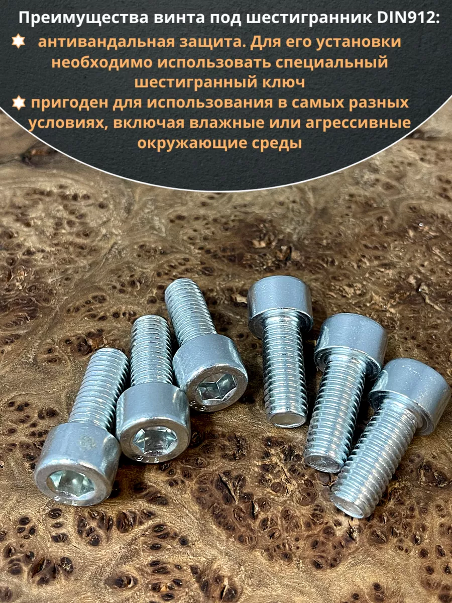 Винт DIN 912 представляет собой металлический стержень с метрической резьбой и головкой цилиндрической формы. Изготовляется из разных материалов, в зависимости от области его применения: сталь 8.8,10.9 или 12,9, сталь с оцинкованным покрытием, нержавеющая сталь А2- А5, латунь, пластик. Прочность на разрыв стали подобного класса достаточно высока, поэтому DIN 912 применяют в конструкциях, которые подвержены серьезным нагрузкам. Применяется винт DIN 912 для специфических нужд (соединения различных элементов металлоконструкций совместно с гайками, шайбами соответствующих размеров) в приборостроении, машиностроении, строительных и иных производственно-промышленных отраслях.