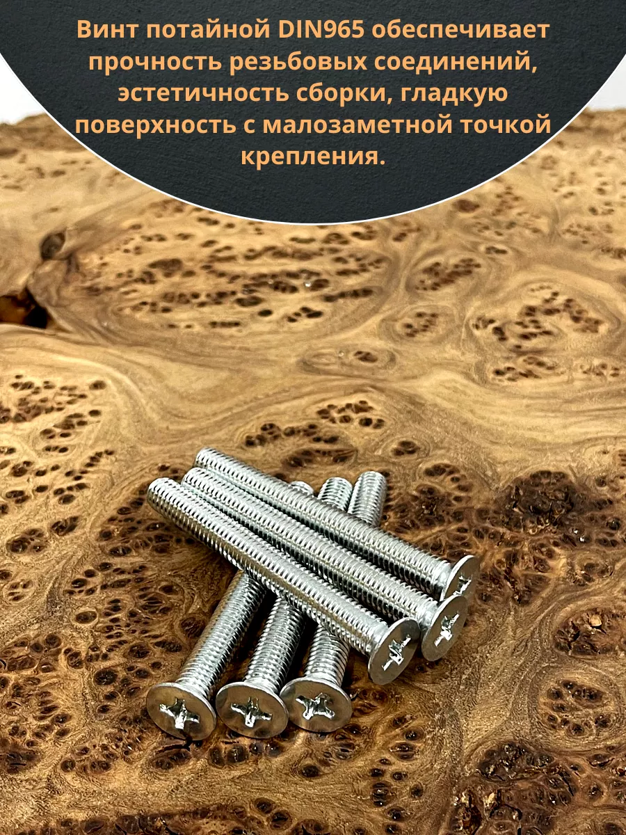 Винт с потайной головкой состоит из головки и стержня с полной резьбой, нарезанной по всей длине шпильки, не имеющего заострения на конце, предназначен для соединения деталей. Монтаж может быть сквозным или глухим. Головка утапливается в материал или конструкцию, не оставаясь на поверхности. Винты DIN 965 используются в строительстве, машиностроении, промышленных и производственных отраслях совместно с шайбами, гайками соответствующих размеров.