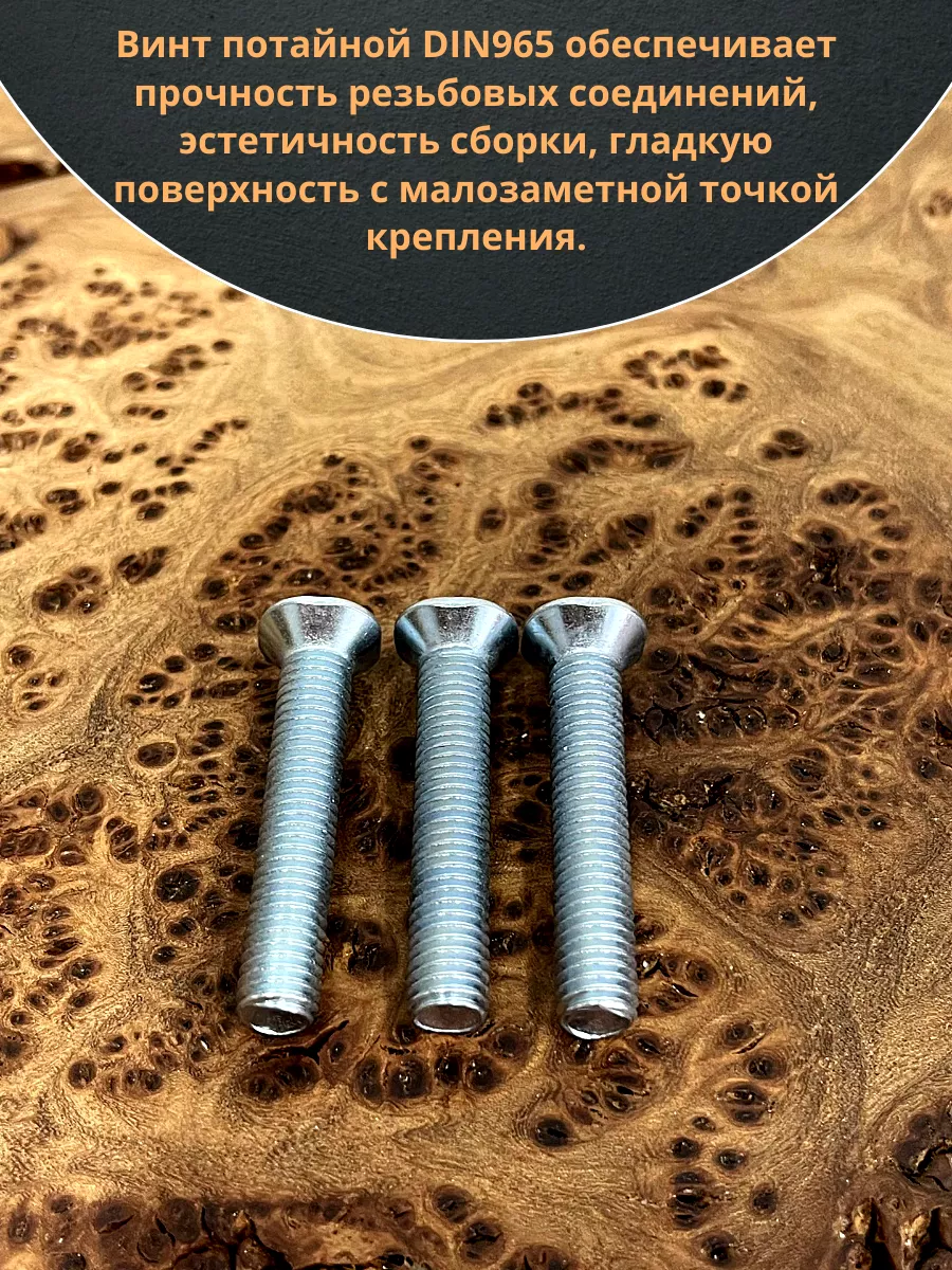 Винт с потайной головкой состоит из головки и стержня с полной резьбой, нарезанной по всей длине шпильки, не имеющего заострения на конце, предназначен для соединения деталей. Монтаж может быть сквозным или глухим. Головка утапливается в материал или конструкцию, не оставаясь на поверхности. Винты DIN 965 используются в строительстве, машиностроении, промышленных и производственных отраслях совместно с шайбами, гайками соответствующих размеров.