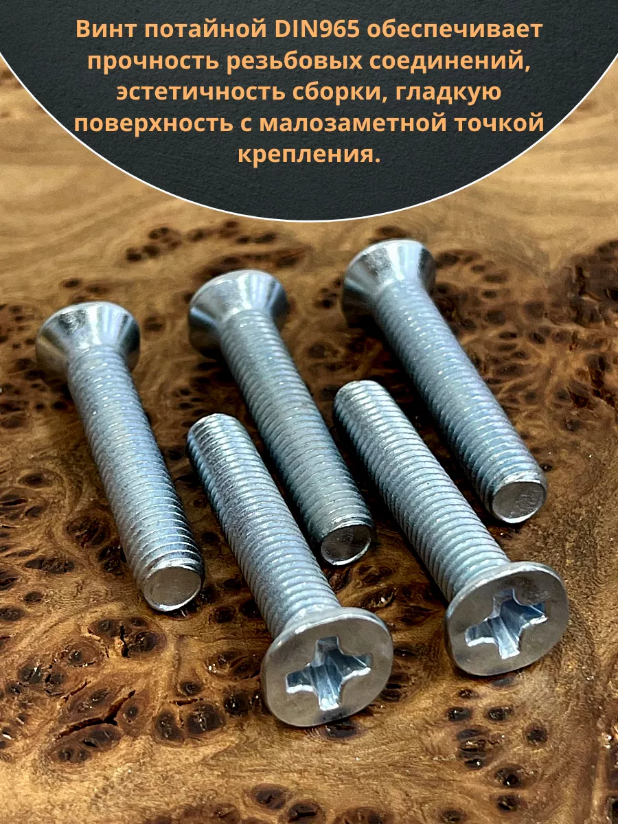 Винт с потайной головкой состоит из головки и стержня с полной резьбой, нарезанной по всей длине шпильки, не имеющего заострения на конце, предназначен для соединения деталей. Монтаж может быть сквозным или глухим. Головка утапливается в материал или конструкцию, не оставаясь на поверхности. Винты DIN 965 используются в строительстве, машиностроении, промышленных и производственных отраслях совместно с шайбами, гайками соответствующих размеров.
