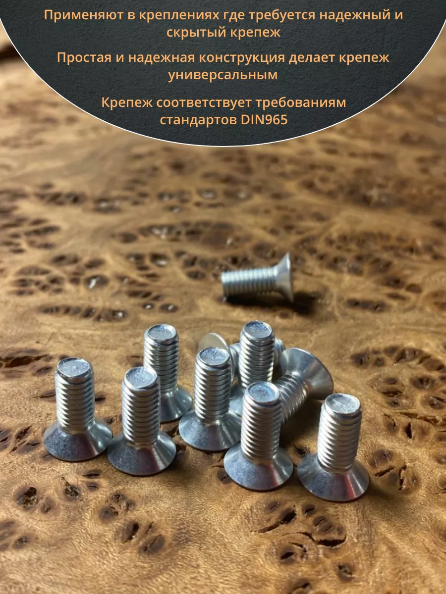 Винт с потайной головкой состоит из головки и стержня с полной резьбой, нарезанной по всей длине шпильки, не имеющего заострения на конце, предназначен для соединения деталей. Монтаж может быть сквозным или глухим. Головка утапливается в материал или конструкцию, не оставаясь на поверхности. Винты DIN 965 используются в строительстве, машиностроении, промышленных и производственных отраслях совместно с шайбами, гайками соответствующих размеров.