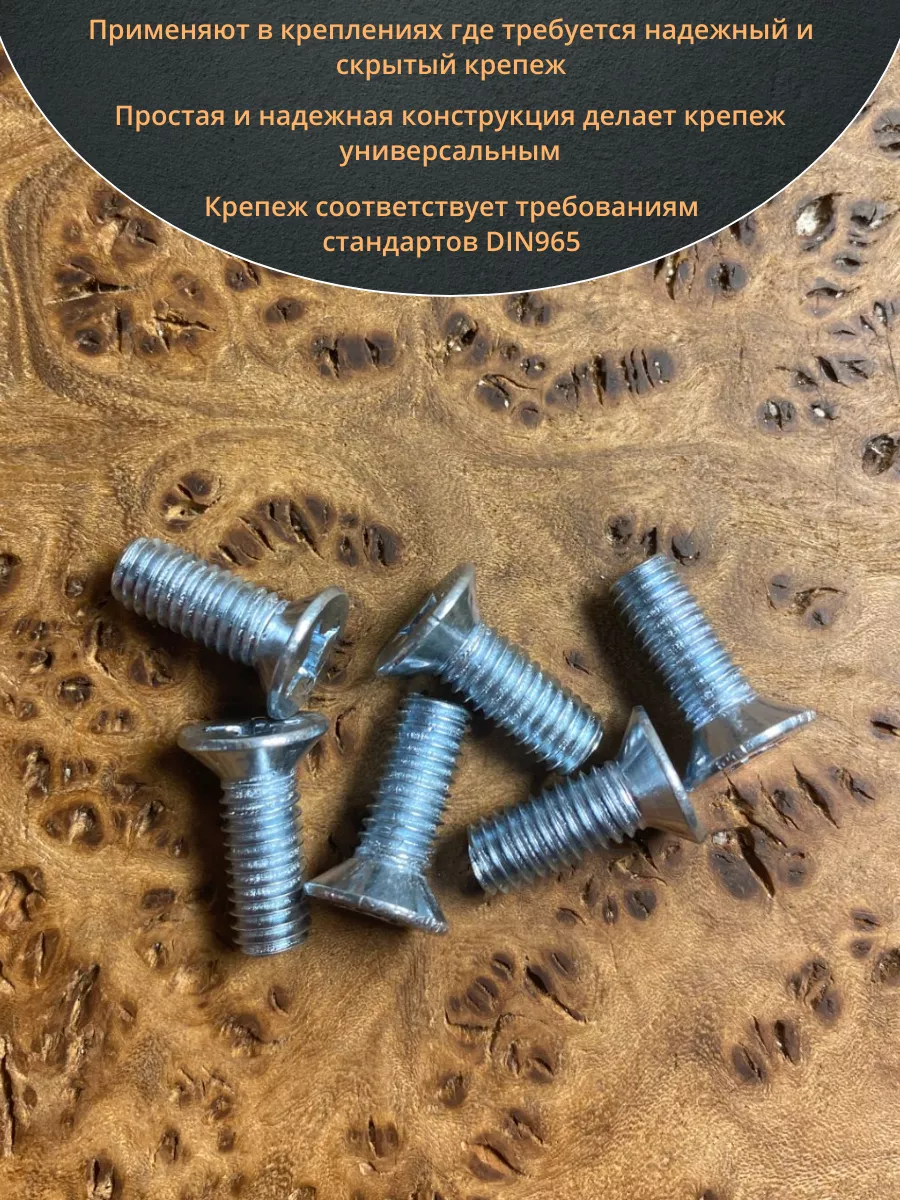 Винт с потайной головкой состоит из головки и стержня с полной резьбой, нарезанной по всей длине шпильки, не имеющего заострения на конце, предназначен для соединения деталей. Монтаж может быть сквозным или глухим. Головка утапливается в материал или конструкцию, не оставаясь на поверхности. Винты DIN 965 используются в строительстве, машиностроении, промышленных и производственных отраслях совместно с шайбами, гайками соответствующих размеров.
