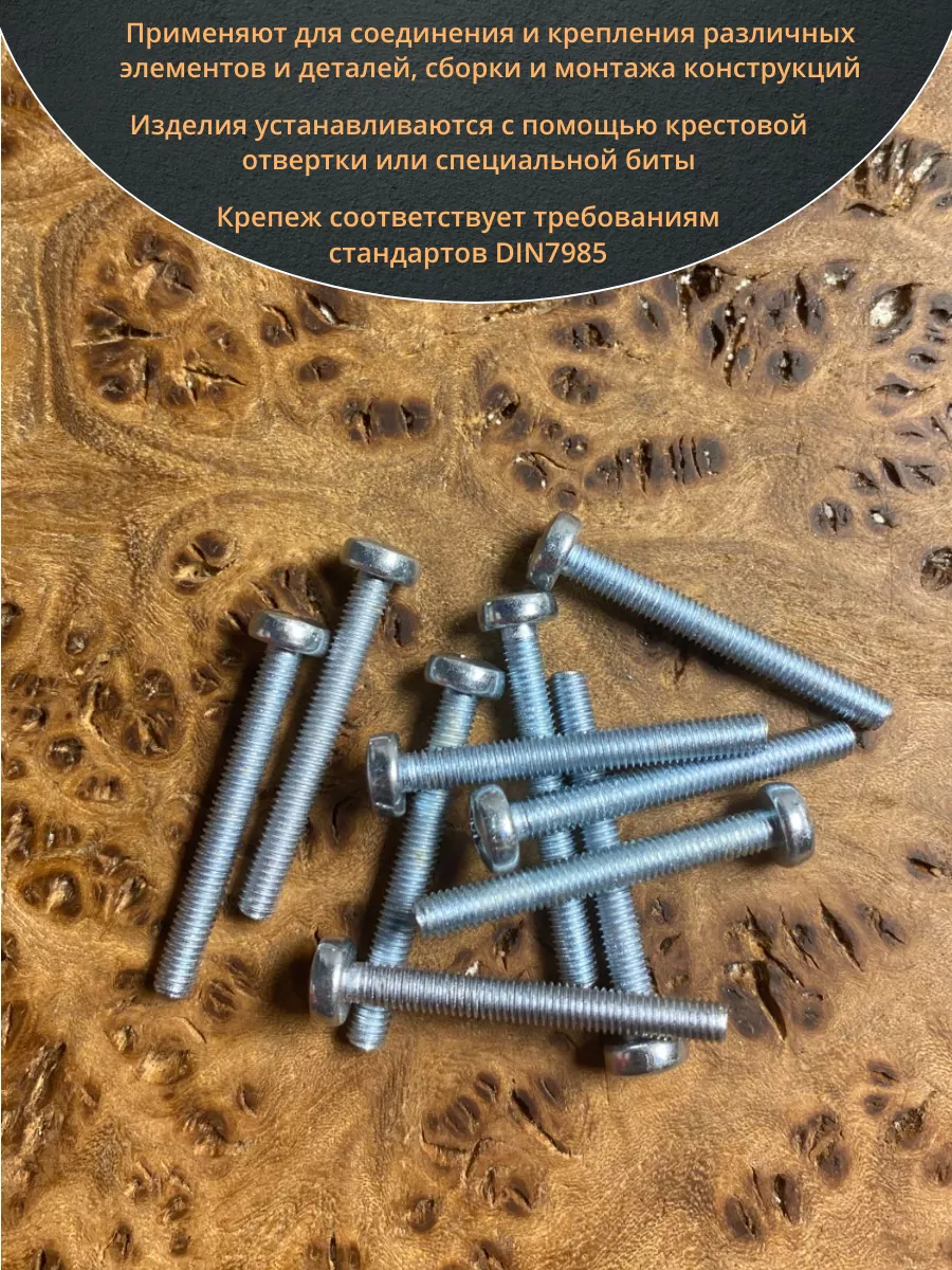 Винт DIN 7985 представляет собой крепежный элемент с полукруглой головкой и шлицем: Philips, Pozi или Torx., подходящим под отвертки и биты. Предназначены для соединения металлических и неметаллических материалов. Винт DIN 7985 используется в производственных, промышленных и строительных областях совместно с шайбами, гайками, втулками и прочими отверстиями с соответствующим размером резьбы, при различных соединениях и креплениях элементов. Производятся из углеродистой стали, нержавеющей стали А2 и А4, латуни, алюминия. Винты, произведенные из углеродистой стали, как правило оцинкованы.
