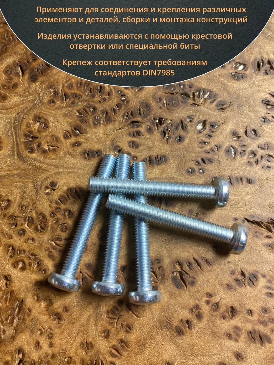 Винт DIN 7985 представляет собой крепежный элемент с полукруглой головкой и шлицем: Philips, Pozi или Torx., подходящим под отвертки и биты. Предназначены для соединения металлических и неметаллических материалов. Винт DIN 7985 используется в производственных, промышленных и строительных областях совместно с шайбами, гайками, втулками и прочими отверстиями с соответствующим размером резьбы, при различных соединениях и креплениях элементов. Производятся из углеродистой стали, нержавеющей стали А2 и А4, латуни, алюминия. Винты, произведенные из углеродистой стали, как правило оцинкованы.