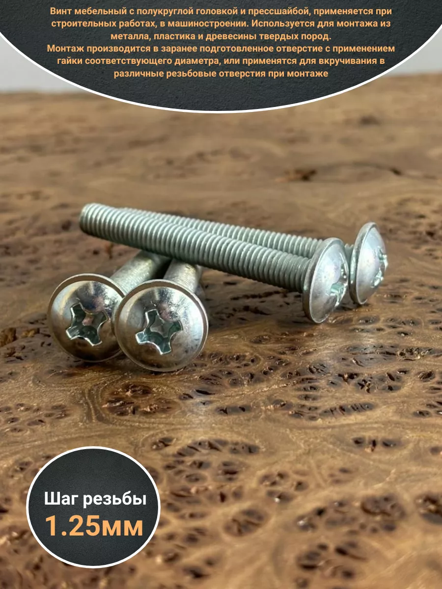 Винт мебельный с полукруглой головкой и прессшайбой, применяется при строительных работах, в машиностроении. Используется для монтажа из металла, пластика и древесины твердых пород. Монтаж производится в заранее подготовленное отверстие с применением гайки соответствующего диаметра, или применятся для вкручивания в различные резьбовые отверстия при монтаже. Винт мебельный DIN 967 — это универсальное крепежное изделие в виде стержня с наружной резьбой, выполненной по всей длинне. Головка крепежа в виде полусферы с широкими полями, на головке имеются пазы под крестовую отвертку. При проведении монтажа можно использовать как PZ, так и SL отвертки или насадки, что делает крепеж универсальным.