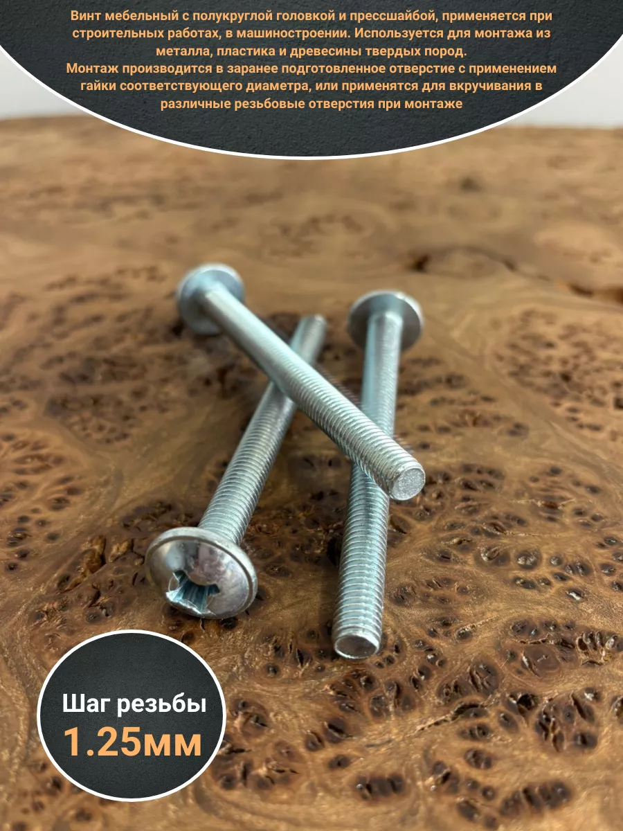 Винт мебельный с полукруглой головкой и прессшайбой, применяется при строительных работах, в машиностроении. Используется для монтажа из металла, пластика и древесины твердых пород. Монтаж производится в заранее подготовленное отверстие с применением гайки соответствующего диаметра, или применятся для вкручивания в различные резьбовые отверстия при монтаже. Винт мебельный DIN 967 — это универсальное крепежное изделие в виде стержня с наружной резьбой, выполненной по всей длинне. Головка крепежа в виде полусферы с широкими полями, на головке имеются пазы под крестовую отвертку. При проведении монтажа можно использовать как PZ, так и SL отвертки или насадки, что делает крепеж универсальным.