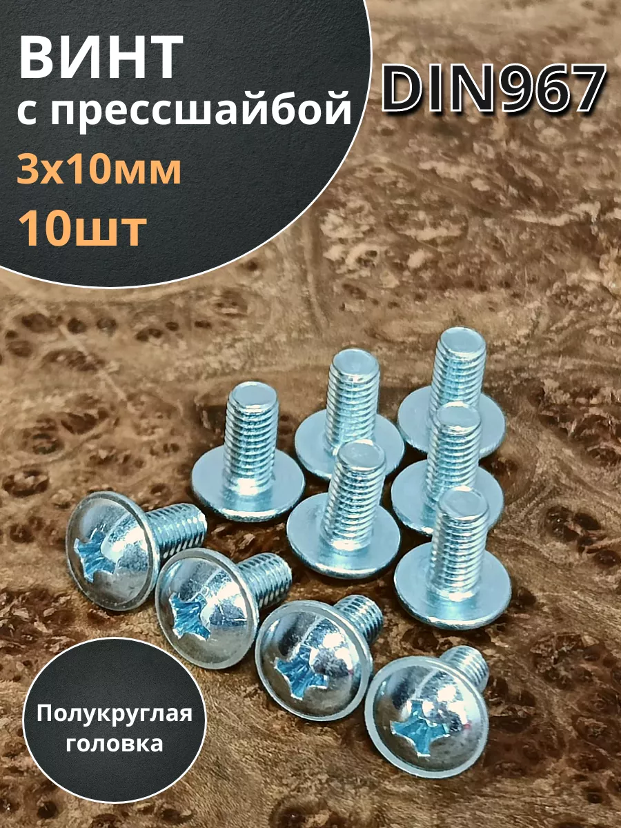Винт с прессшайбой М3х10 мебельный DIN967 ,10 шт.