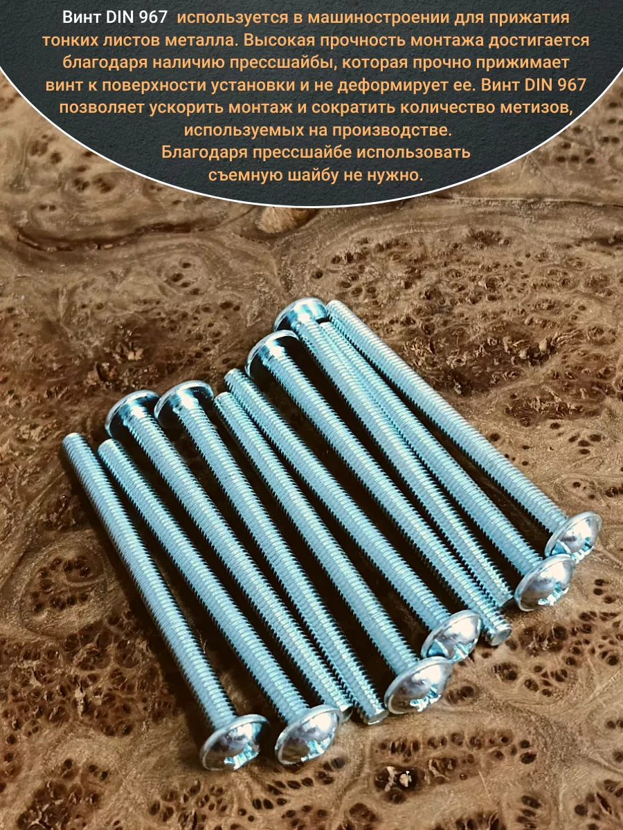 Винт мебельный с полукруглой головкой и прессшайбой, применяется при строительных работах, в машиностроении. Используется для монтажа из металла, пластика и древесины твердых пород. Монтаж производится в заранее подготовленное отверстие с применением гайки соответствующего диаметра, или применятся для вкручивания в различные резьбовые отверстия при монтаже. Винт мебельный DIN 967 — это универсальное крепежное изделие в виде стержня с наружной резьбой, выполненной по всей длинне. Головка крепежа в виде полусферы с широкими полями, на головке имеются пазы под крестовую отвертку. При проведении монтажа можно использовать как PZ, так и SL отвертки или насадки, что делает крепеж универсальным.