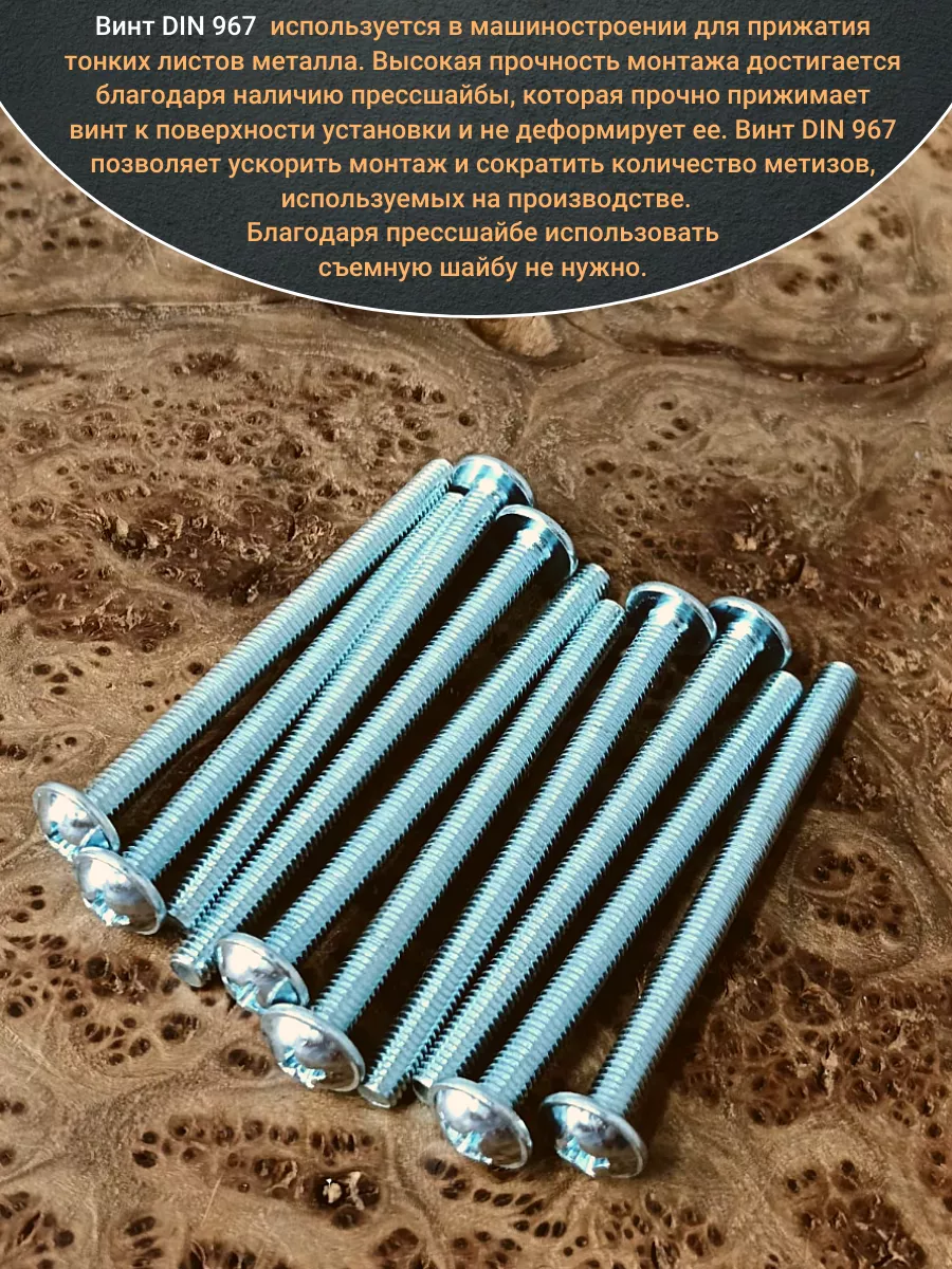 Винт мебельный с полукруглой головкой и прессшайбой, применяется при строительных работах, в машиностроении. Используется для монтажа из металла, пластика и древесины твердых пород. Монтаж производится в заранее подготовленное отверстие с применением гайки соответствующего диаметра, или применятся для вкручивания в различные резьбовые отверстия при монтаже. Винт мебельный DIN 967 — это универсальное крепежное изделие в виде стержня с наружной резьбой, выполненной по всей длинне. Головка крепежа в виде полусферы с широкими полями, на головке имеются пазы под крестовую отвертку. При проведении монтажа можно использовать как PZ, так и SL отвертки или насадки, что делает крепеж универсальным.