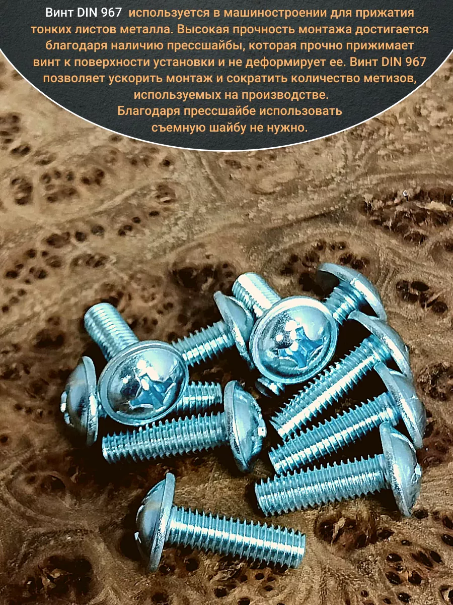 Винт мебельный с полукруглой головкой и прессшайбой, применяется при строительных работах, в машиностроении. Используется для монтажа из металла, пластика и древесины твердых пород. Монтаж производится в заранее подготовленное отверстие с применением гайки соответствующего диаметра, или применятся для вкручивания в различные резьбовые отверстия при монтаже. Винт мебельный DIN 967 — это универсальное крепежное изделие в виде стержня с наружной резьбой, выполненной по всей длинне. Головка крепежа в виде полусферы с широкими полями, на головке имеются пазы под крестовую отвертку. При проведении монтажа можно использовать как PZ, так и SL отвертки или насадки, что делает крепеж универсальным.