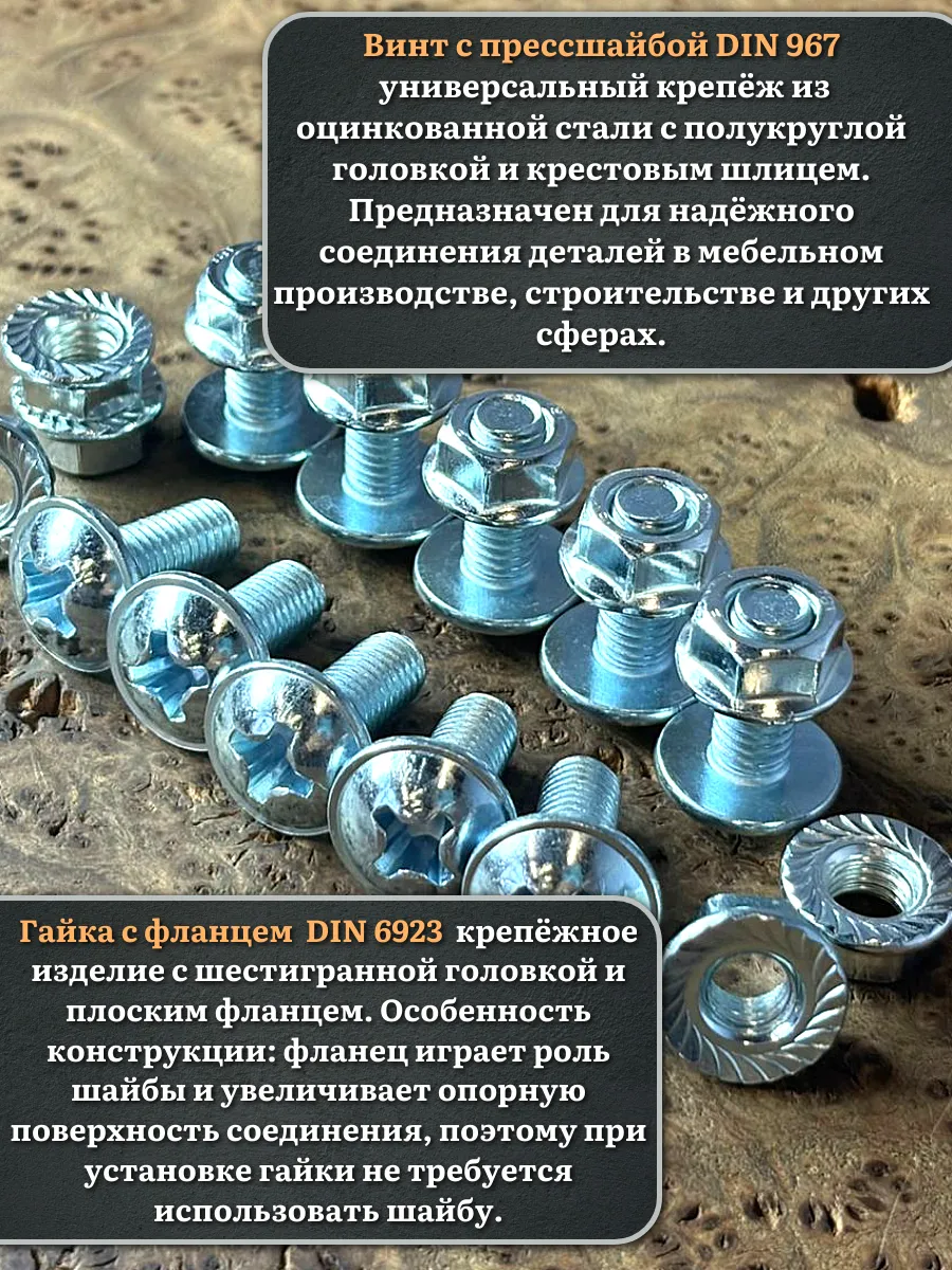Винт мебельный с полукруглой головкой и прессшайбой, применяется при строительных работах, в машиностроении. Используется для монтажа из металла, пластика и древесины твердых пород. Монтаж производится в заранее подготовленное отверстие с применением гайки соответствующего диаметра, или применятся для вкручивания в различные резьбовые отверстия при монтаже.