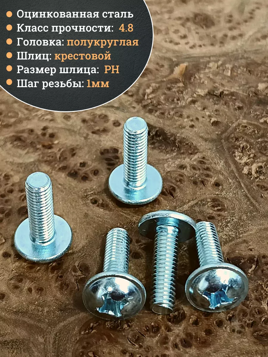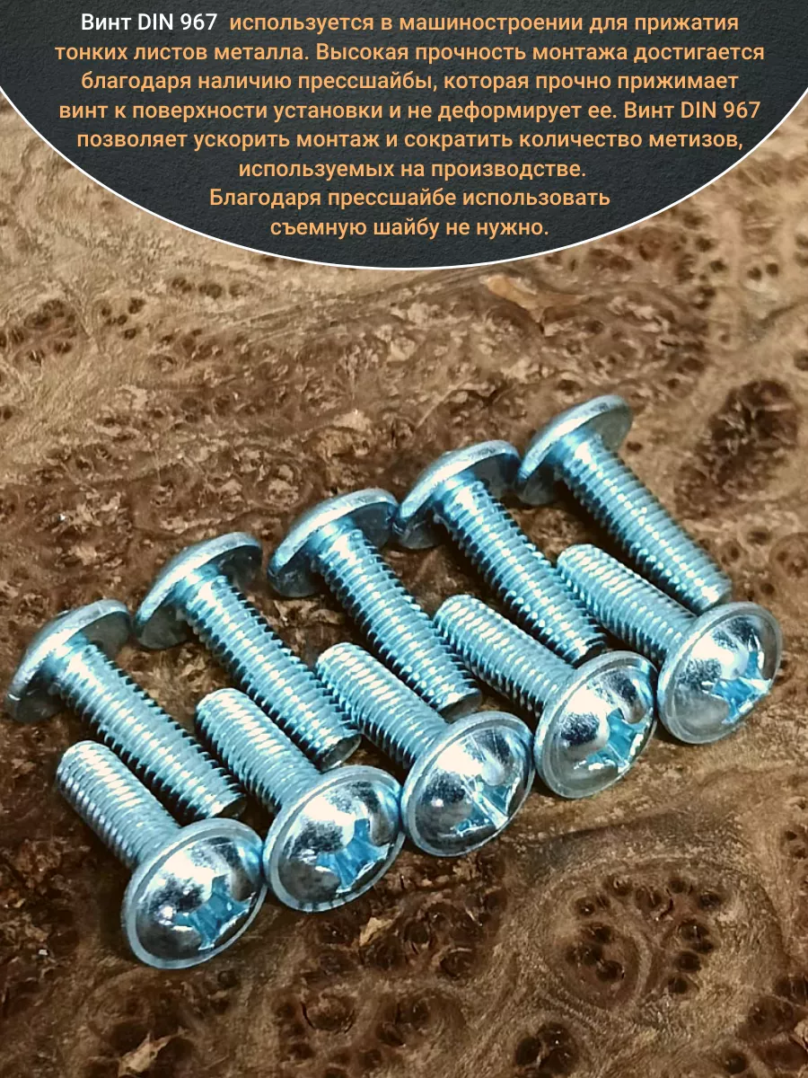 Винт мебельный с полукруглой головкой и прессшайбой, применяется при строительных работах, в машиностроении. Используется для монтажа из металла, пластика и древесины твердых пород. Монтаж производится в заранее подготовленное отверстие с применением гайки соответствующего диаметра, или применятся для вкручивания в различные резьбовые отверстия при монтаже. Винт мебельный DIN 967 — это универсальное крепежное изделие в виде стержня с наружной резьбой, выполненной по всей длинне. Головка крепежа в виде полусферы с широкими полями, на головке имеются пазы под крестовую отвертку. При проведении монтажа можно использовать как PZ, так и SL отвертки или насадки, что делает крепеж универсальным.