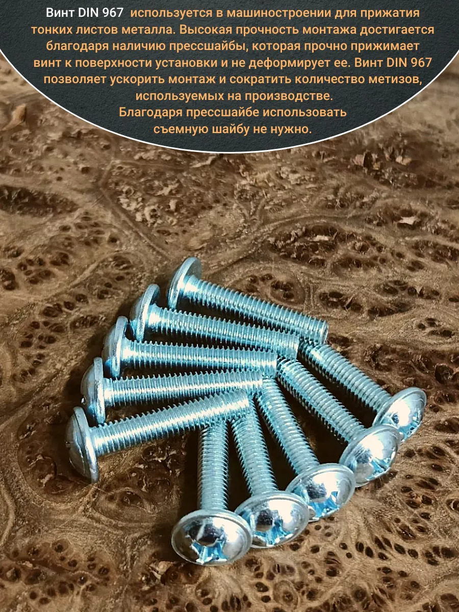 Винт мебельный DIN 967 — это универсальное крепежное изделие в виде стержня с наружной резьбой, выполненной по всей длиннее. Головка крепежа в виде полусферы с широкими полями, на головки имеются пазы под крестовую отвертку. При проведении монтажа можно использовать как PZ, так и SL отвертки или насадки, что делает крепеж универсальным.