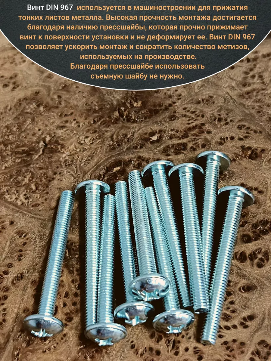 Винт мебельный с полукруглой головкой и прессшайбой, применяется при строительных работах, в машиностроении. Используется для монтажа из металла, пластика и древесины твердых пород. Монтаж производится в заранее подготовленное отверстие с применением гайки соответствующего диаметра, или применятся для вкручивания в различные резьбовые отверстия при монтаже. Винт мебельный DIN 967 — это универсальное крепежное изделие в виде стержня с наружной резьбой, выполненной по всей длинне. Головка крепежа в виде полусферы с широкими полями, на головке имеются пазы под крестовую отвертку. При проведении монтажа можно использовать как PZ, так и SL отвертки или насадки, что делает крепеж универсальным.
