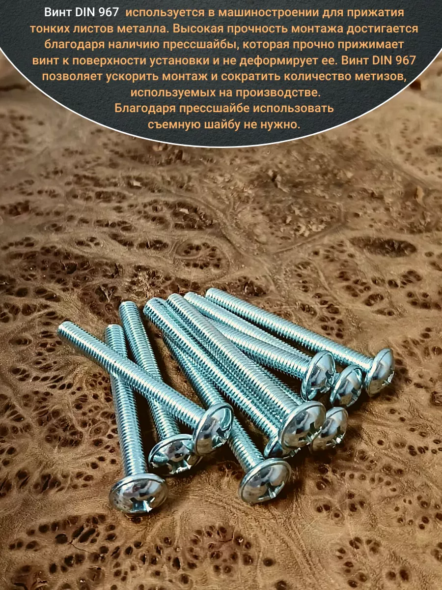 Винт мебельный с полукруглой головкой и прессшайбой, применяется при строительных работах, в машиностроении. Используется для монтажа из металла, пластика и древесины твердых пород. Монтаж производится в заранее подготовленное отверстие с применением гайки соответствующего диаметра, или применятся для вкручивания в различные резьбовые отверстия при монтаже. Винт мебельный DIN 967 — это универсальное крепежное изделие в виде стержня с наружной резьбой, выполненной по всей длинне. Головка крепежа в виде полусферы с широкими полями, на головке имеются пазы под крестовую отвертку. При проведении монтажа можно использовать как PZ, так и SL отвертки или насадки, что делает крепеж универсальным.