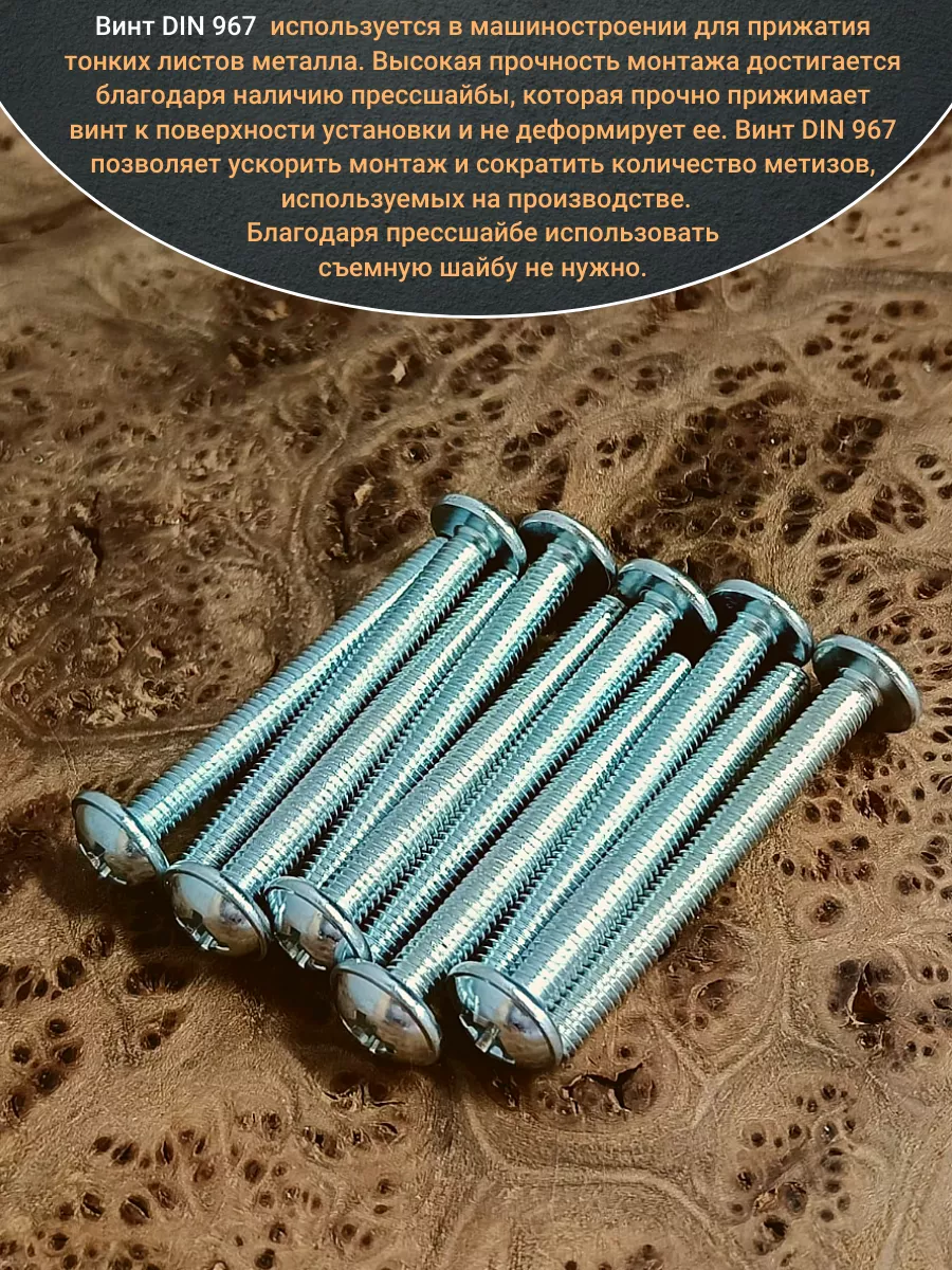Винт мебельный с полукруглой головкой и прессшайбой, применяется при строительных работах, в машиностроении. Используется для монтажа из металла, пластика и древесины твердых пород. Монтаж производится в заранее подготовленное отверстие с применением гайки соответствующего диаметра, или применятся для вкручивания в различные резьбовые отверстия при монтаже. Винт мебельный DIN 967 — это универсальное крепежное изделие в виде стержня с наружной резьбой, выполненной по всей длинне. Головка крепежа в виде полусферы с широкими полями, на головке имеются пазы под крестовую отвертку. При проведении монтажа можно использовать как PZ, так и SL отвертки или насадки, что делает крепеж универсальным.