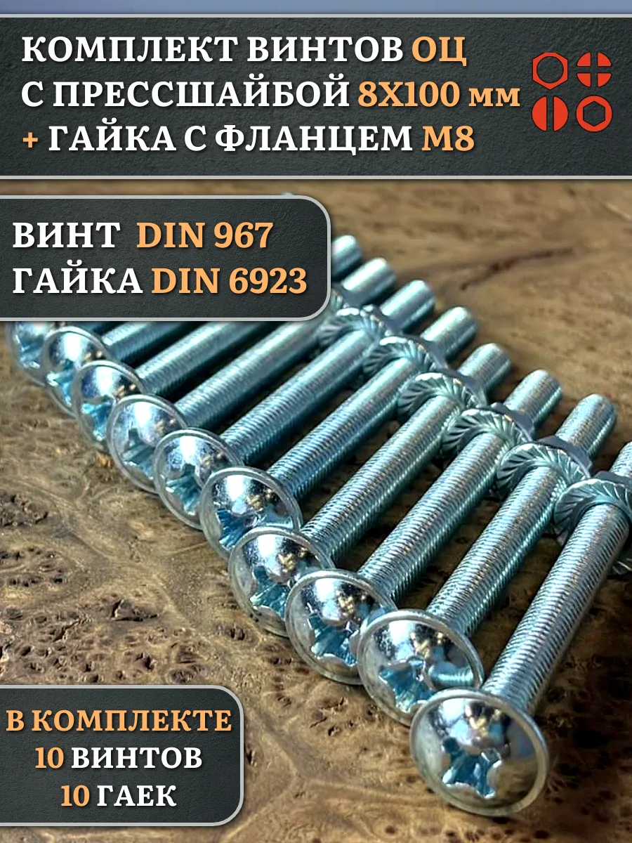 Винт с прессшайбой М8х100 DIN967 с гайкой фланец, 10 шт.