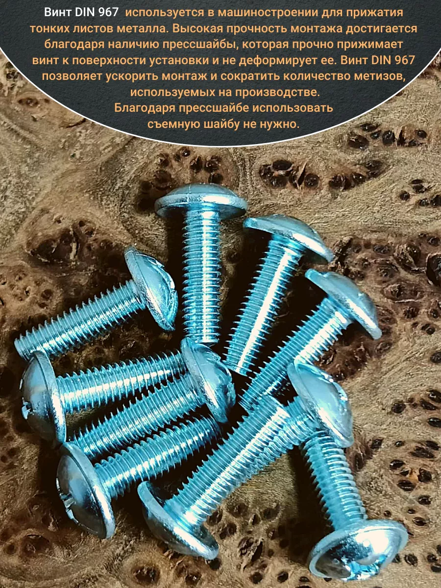 Винт мебельный с полукруглой головкой и прессшайбой, применяется при строительных работах, в машиностроении. Используется для монтажа из металла, пластика и древесины твердых пород. Монтаж производится в заранее подготовленное отверстие с применением гайки соответствующего диаметра, или применятся для вкручивания в различные резьбовые отверстия при монтаже. Винт мебельный DIN 967 — это универсальное крепежное изделие в виде стержня с наружной резьбой, выполненной по всей длинне. Головка крепежа в виде полусферы с широкими полями, на головке имеются пазы под крестовую отвертку. При проведении монтажа можно использовать как PZ, так и SL отвертки или насадки, что делает крепеж универсальным.