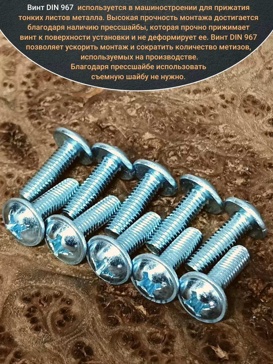 Винт мебельный DIN 967 — это универсальное крепежное изделие в виде стержня с наружной резьбой, выполненной по всей длиннее. Головка крепежа в виде полусферы с широкими полями, на головки имеются пазы под крестовую отвертку. При проведении монтажа можно использовать как PZ, так и SL отвертки или насадки, что делает крепеж универсальным.