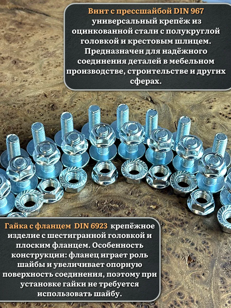 Винт мебельный с полукруглой головкой и прессшайбой, применяется при строительных работах, в машиностроении. Используется для монтажа из металла, пластика и древесины твердых пород. Монтаж производится в заранее подготовленное отверстие с применением гайки соответствующего диаметра, или применятся для вкручивания в различные резьбовые отверстия при монтаже. Винт мебельный DIN 967 — это универсальное крепежное изделие в виде стержня с наружной резьбой, выполненной по всей длинне. Головка крепежа в виде полусферы с широкими полями, на головке имеются пазы под крестовую отвертку. При проведении монтажа можно использовать как PZ, так и SL отвертки или насадки, что делает крепеж универсальным.