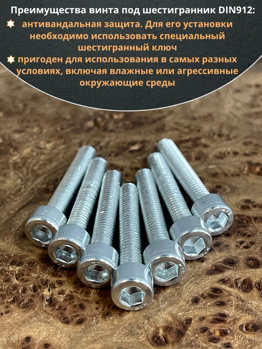 Винт DIN 912 представляет собой металлический стержень с метрической резьбой и головкой цилиндрической формы. Изготовляется из разных материалов, в зависимости от области его применения: сталь 8.8,10.9 или 12,9, сталь с оцинкованным покрытием, нержавеющая сталь А2- А5, латунь, пластик. Прочность на разрыв стали подобного класса достаточно высока, поэтому DIN 912 применяют в конструкциях, которые подвержены серьезным нагрузкам. Применяется винт DIN 912 для специфических нужд (соединения различных элементов металлоконструкций совместно с гайками, шайбами соответствующих размеров) в приборостроении, машиностроении, строительных и иных производственно-промышленных отраслях.
