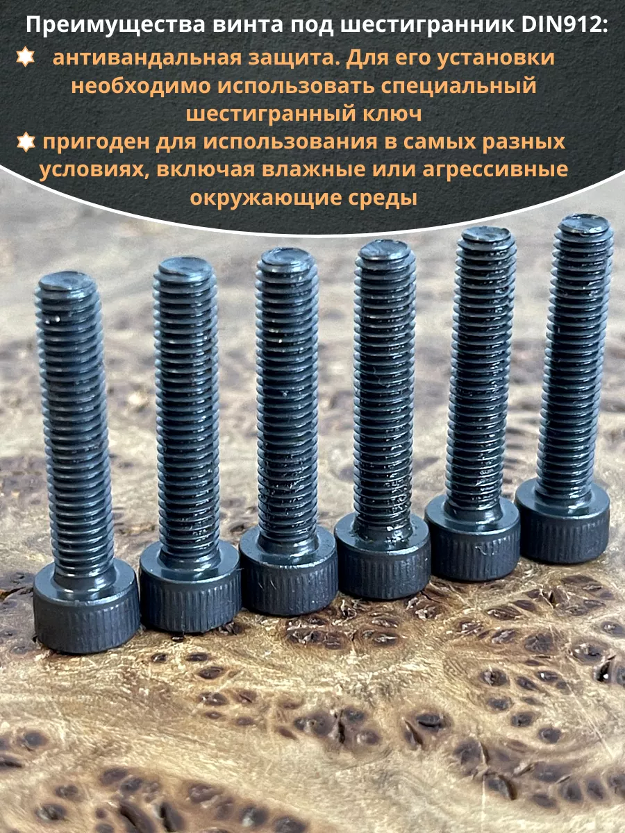 Винт имеет высокую цилиндрическую головку, предназначен для установки его с углублением в отверстие. Закручивается винт при помощи ключа-шестигранника. Высокопрочный винт DIN 912 обеспечивает надежное скрепление узлов и деталей в монтажных и других видах работ. Он имеет головку цилиндрической формы с углублением под соответствующий шестигранный ключ.