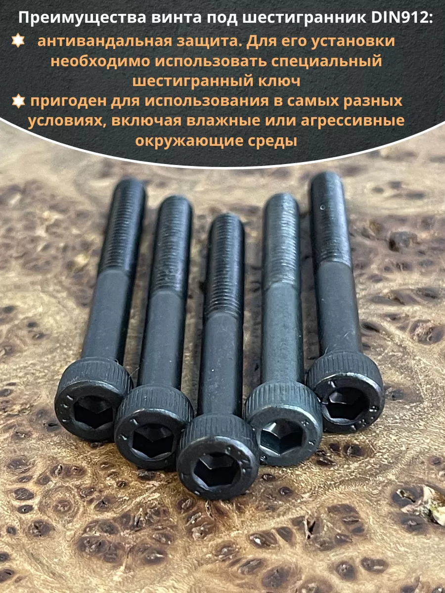 Винт имеет высокую цилиндрическую головку, предназначен для установки его с углублением в отверстие. Закручивается винт при помощи ключа-шестигранника. Высокопрочный винт DIN 912 обеспечивает надежное скрепление узлов и деталей в монтажных и других видах работ. Он имеет головку цилиндрической формы с углублением под соответствующий шестигранный ключ.