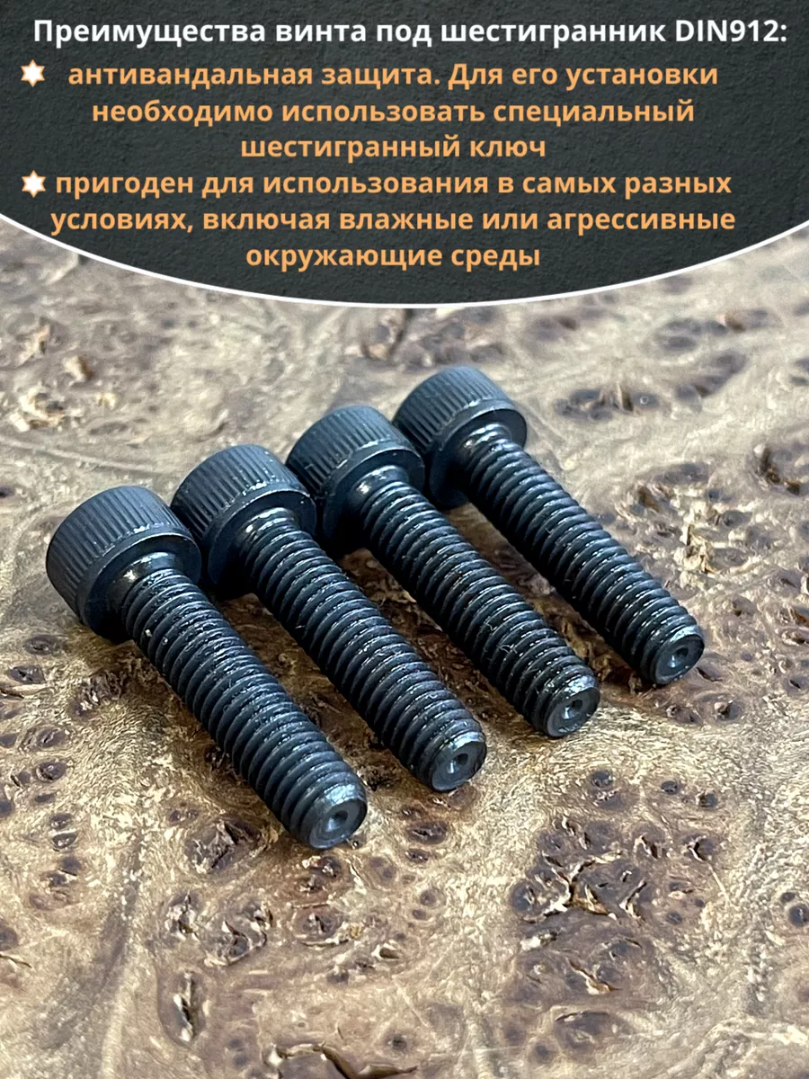 Винт имеет высокую цилиндрическую головку, предназначен для установки его с углублением в отверстие. Закручивается винт при помощи ключа-шестигранника. Высокопрочный винт DIN 912 обеспечивает надежное скрепление узлов и деталей в монтажных и других видах работ. Он имеет головку цилиндрической формы с углублением под соответствующий шестигранный ключ.