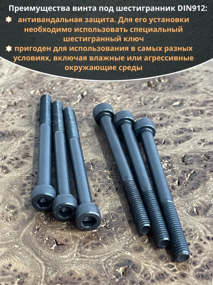 Винт имеет высокую цилиндрическую головку, предназначен для установки его с углублением в отверстие. Закручивается винт при помощи ключа-шестигранника. Высокопрочный винт DIN 912 обеспечивает надежное скрепление узлов и деталей в монтажных и других видах работ. Он имеет головку цилиндрической формы с углублением под соответствующий шестигранный ключ.