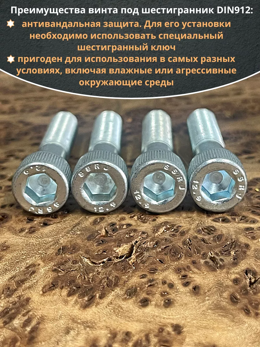 Винт (болт) с внутренним шестигранником (оцинкованный) DIN 912 – высокопрочный метрический крепеж из стали класса прочности 12.9 с цинковым покрытием, без которого не обходятся такие отрасли промышленности как машиностроение, приборостроение, производство станков, промышленного оборудования, дорожной и строительной техники. Механические свойства винта под шестигранник гарантируют надежность узла крепления при повышенных нагрузках и вибрации, возможность приложения высокого момента затяжки при помощи имбусового ключа и возможность многократной сборки/разборки без риска быстрого износа шлица. Гальваническая оцинковка болтов с внутренним шестигранником защищает их от коррозии в нормальных и слабоагрессивных условиях внешней среды. Высокопрочные винты с цилиндрической головкой под ключ-шестигранник выпускаются в классе высокой точности – А, с полем допуска резьбы 6g и в широком диапазоне диаметров и длин. Изделия имеют стержень с полной или неполной резьбой.