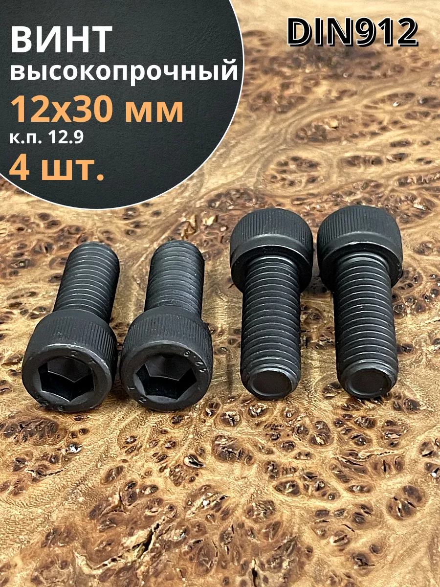 Винт высокопрочный ПР М12х30 мм к.п.12.9 черный DIN912, 4 шт.